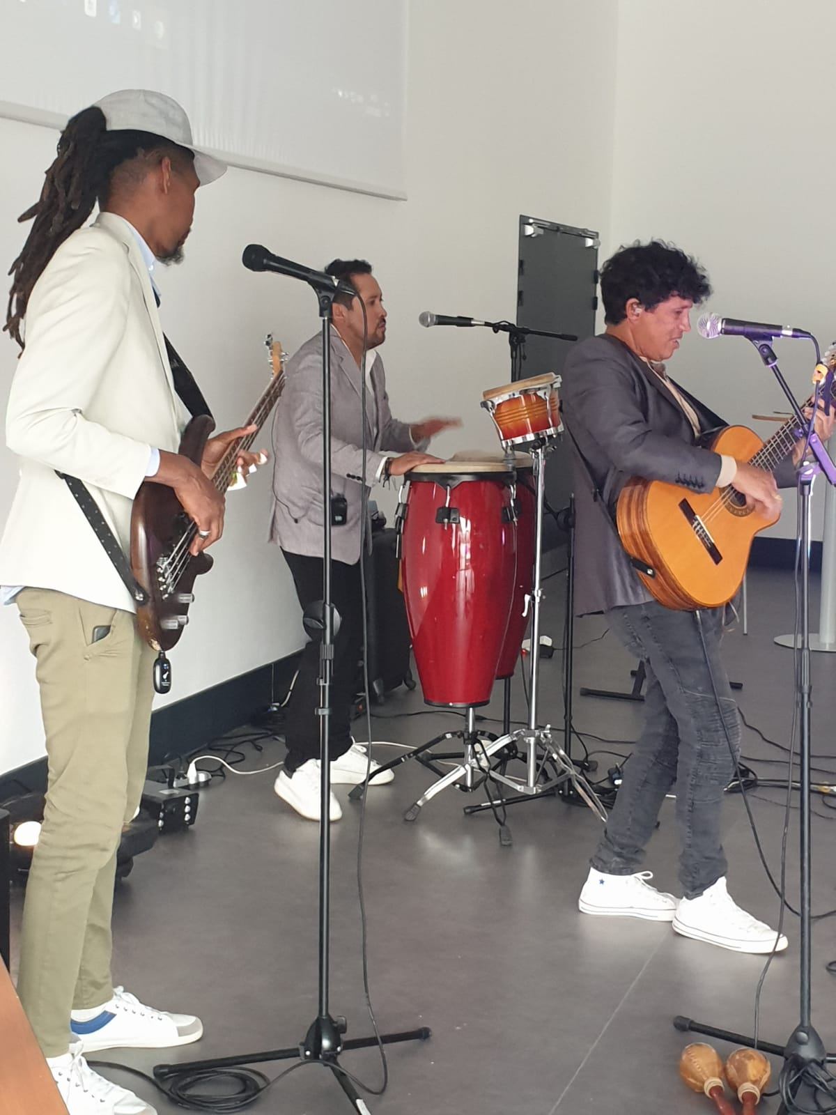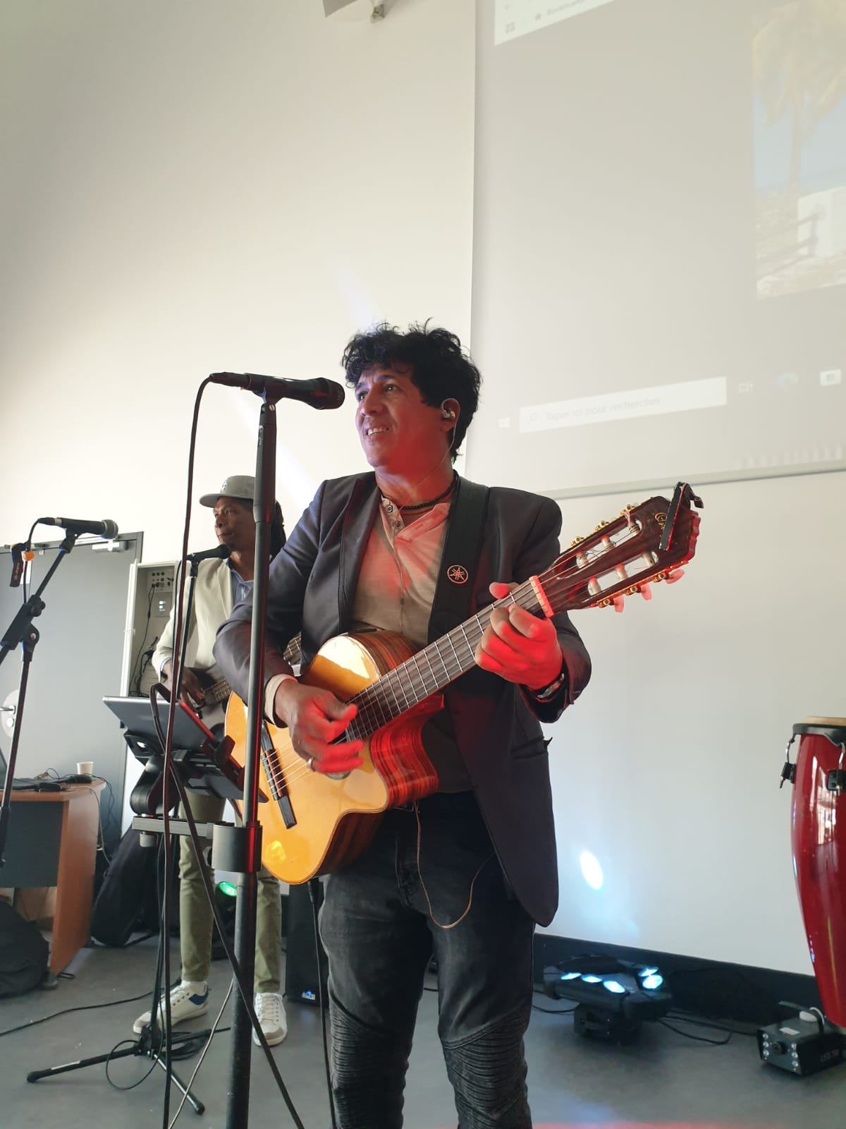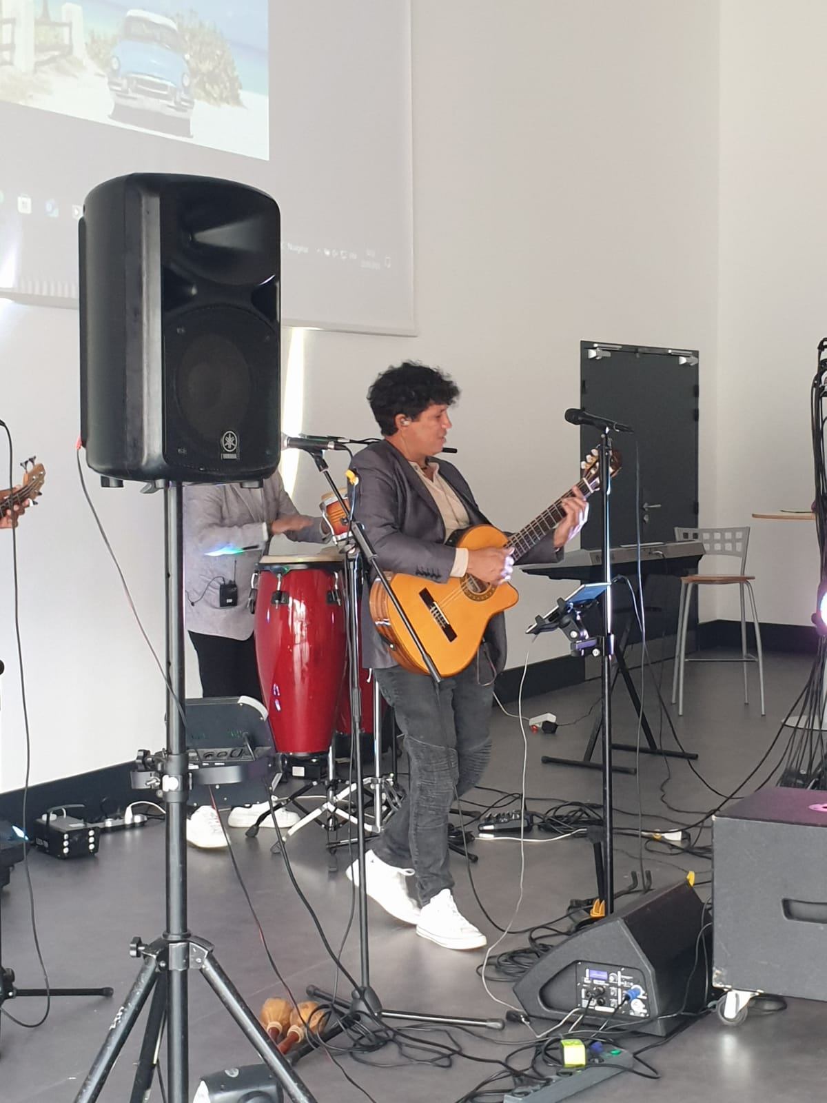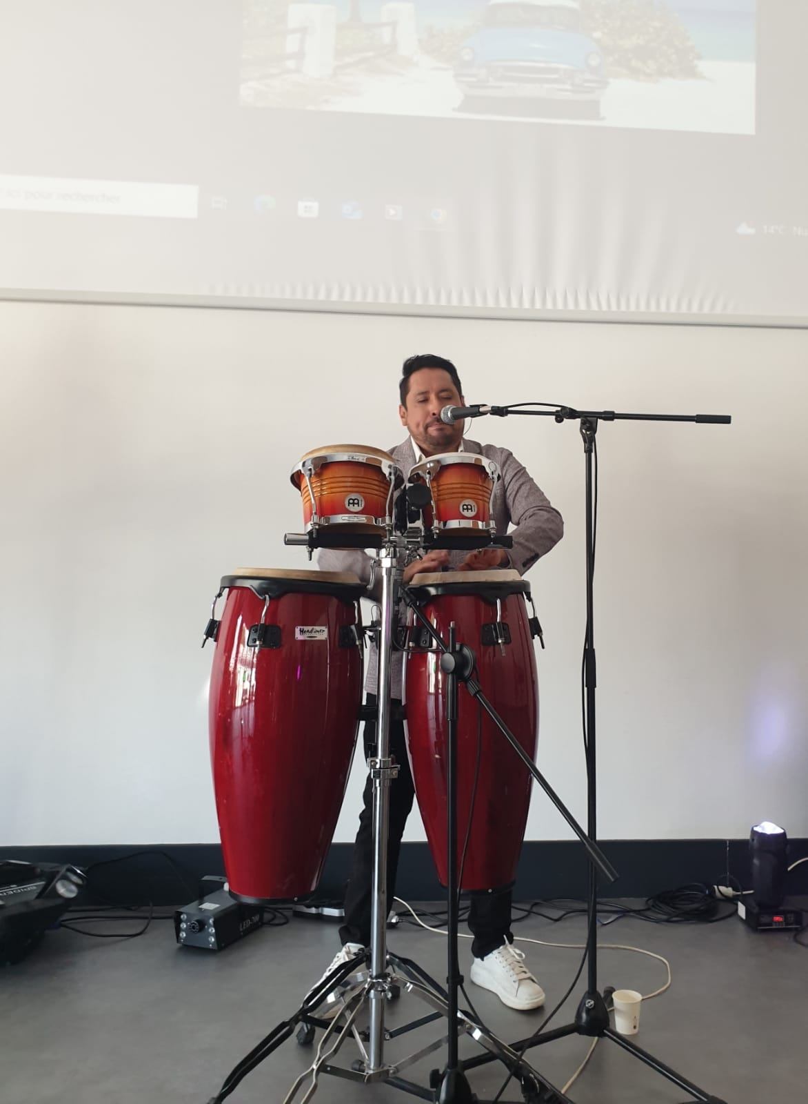 « Spectacle interatif et pluriculturel, Beni Medina, musicien, chanteur auteur-compositeur cubain et Géraldine, danseuse, proposent une découverte des musiques et danses traditionnelles et actuelles d’Amérique latine et des Caraïbes. Faite de métissages, cette musique établit un lien étroit entre chant, rythme et danse. Les activités dans les classes font pratiquer ces 3 éléments séparément pour ensuite les rassembler et obtenir une fusion en concert. Choisies en amont avec les professeurs, les élèves partagent avec les musiciens des chansons en espagnol, mais aussi parfois en anglais, car le groupe peut mettre dans son répertoire des chansons occidentales en version latine : Stand by me, Hôtel California…. Ce projet sur une ou plusieurs séances scolaires contribue à l’apprentissage actif et créatif et met clairement en avant des outils de communication, de langage, de développement physique, d’expression artistique….. Les artistes sont basés en Bretagne »