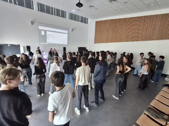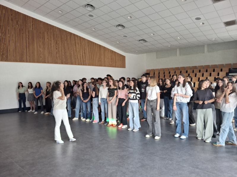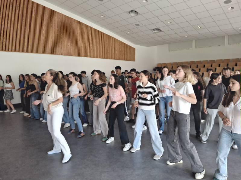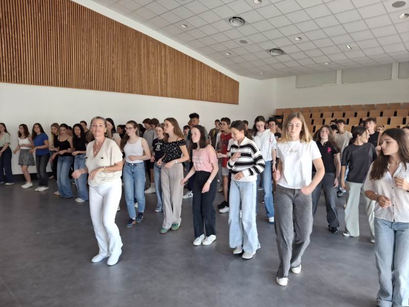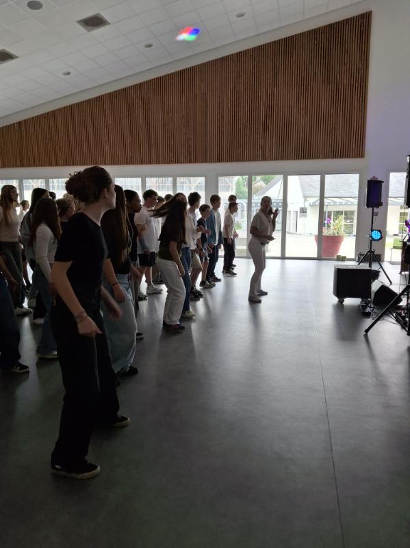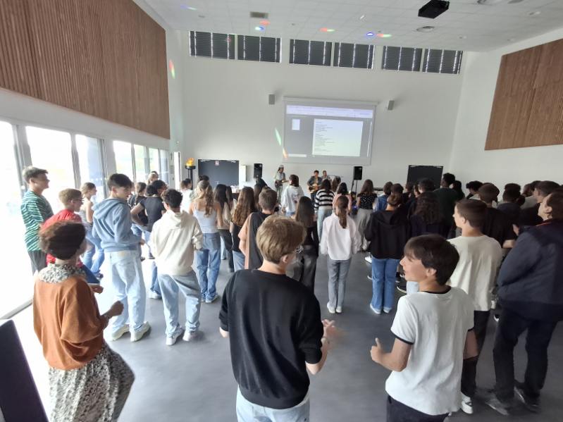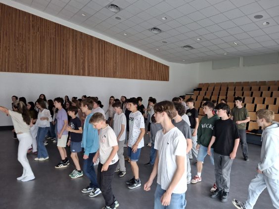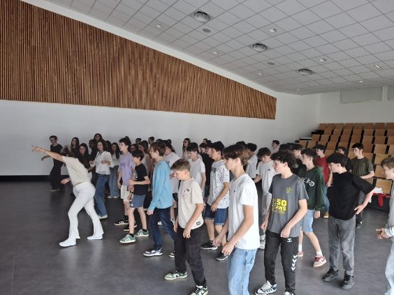 A l’initiative de Mme Deschâteaux, professeure de musique et chorale au collège, les élèves de 3e ont eu la chance de rencontrer des musiciens, chanter les titres préparés en cours de musique et pratiquer les pas travaillés en EPS.