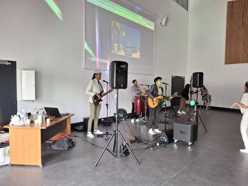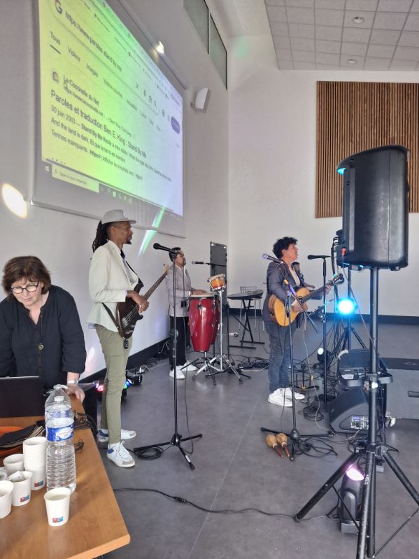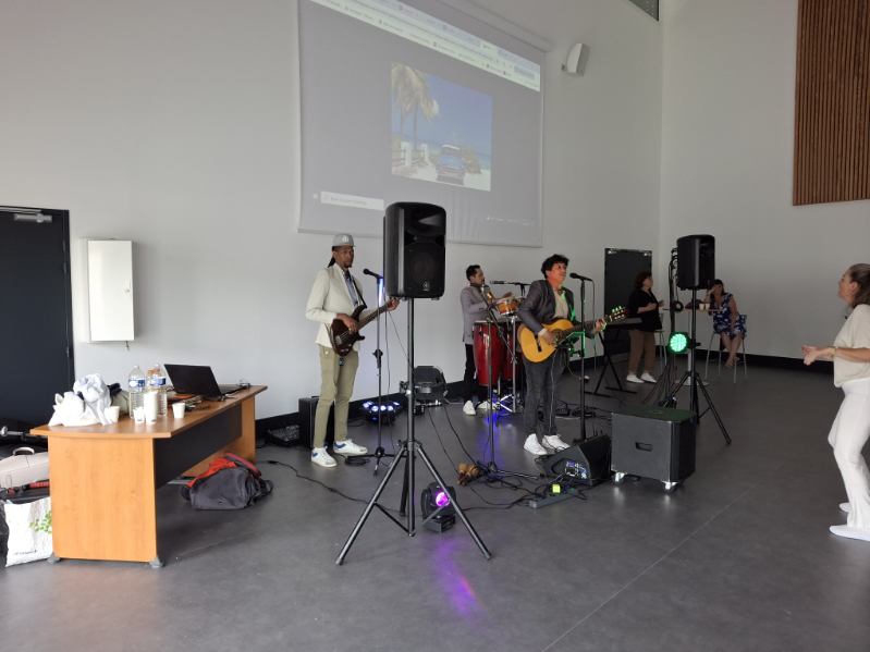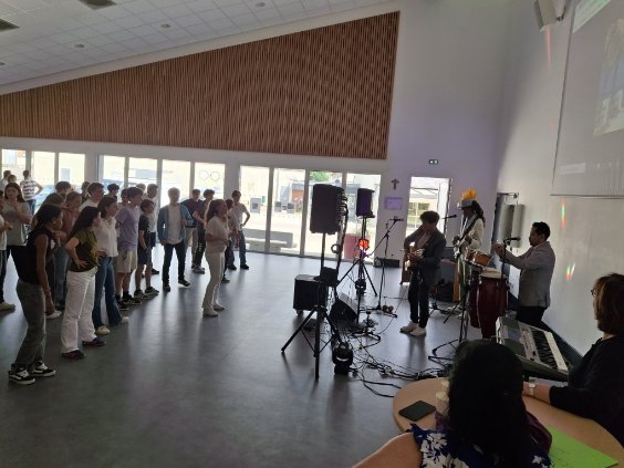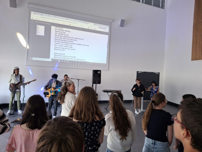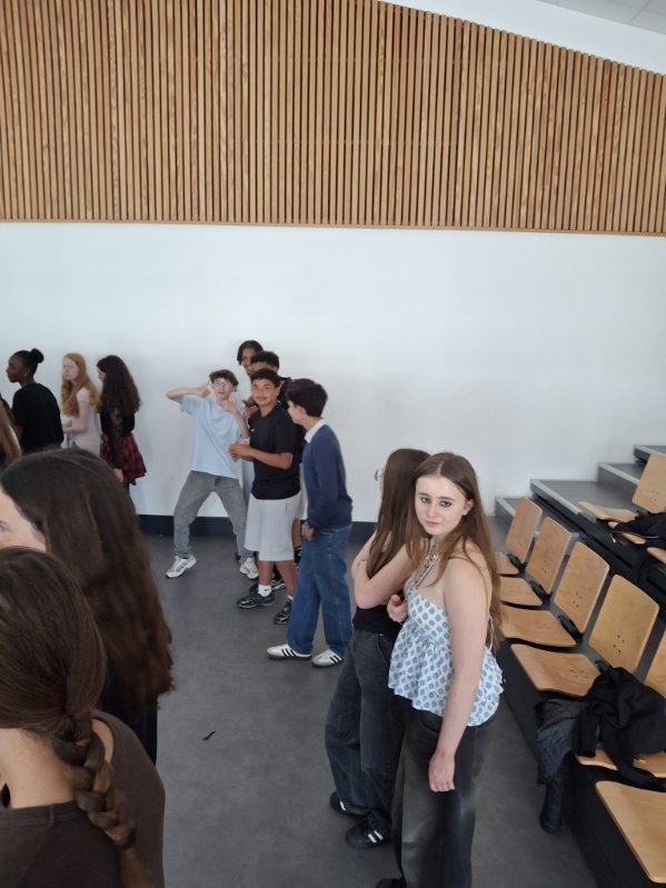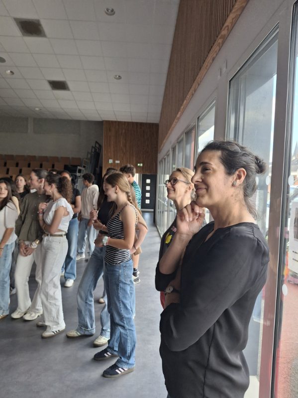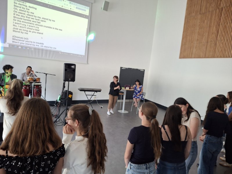 A l’initiative de Mme Deschâteaux, professeure de musique et chorale au collège, les élèves de 3e ont eu la chance de rencontrer des musiciens, chanter les titres préparés en cours de musique et pratiquer les pas travaillés en EPS.